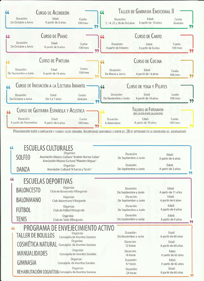 El Ayto. de Villatorres organiza diversos cursos según el último boletin informativo que se ha repartido en los últimos días. Las inscripciones a las escuelas, cursos y talleres municipales se podrán realizar en la Conserjería del Ayuntamiento o dirigiéndose a los alcaldes pedáneos de Torrequebradilla y Vados de Torralba. Según informan, los cursos se realizarán según demanda. Además ofrecen diversas vías de contacto para todo aquel que desee obtener más información a través del teléfono 37 77 00 - Extensión 26 o del correo electrónico Esta dirección de correo electrónico está siendo protegida contra los robots de spam. Necesita tener JavaScript habilitado para poder verlo.