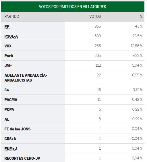Resultados obtenidos en Villatorres en las elecciones autonómicas celebradas el 19 de junio de 2022.