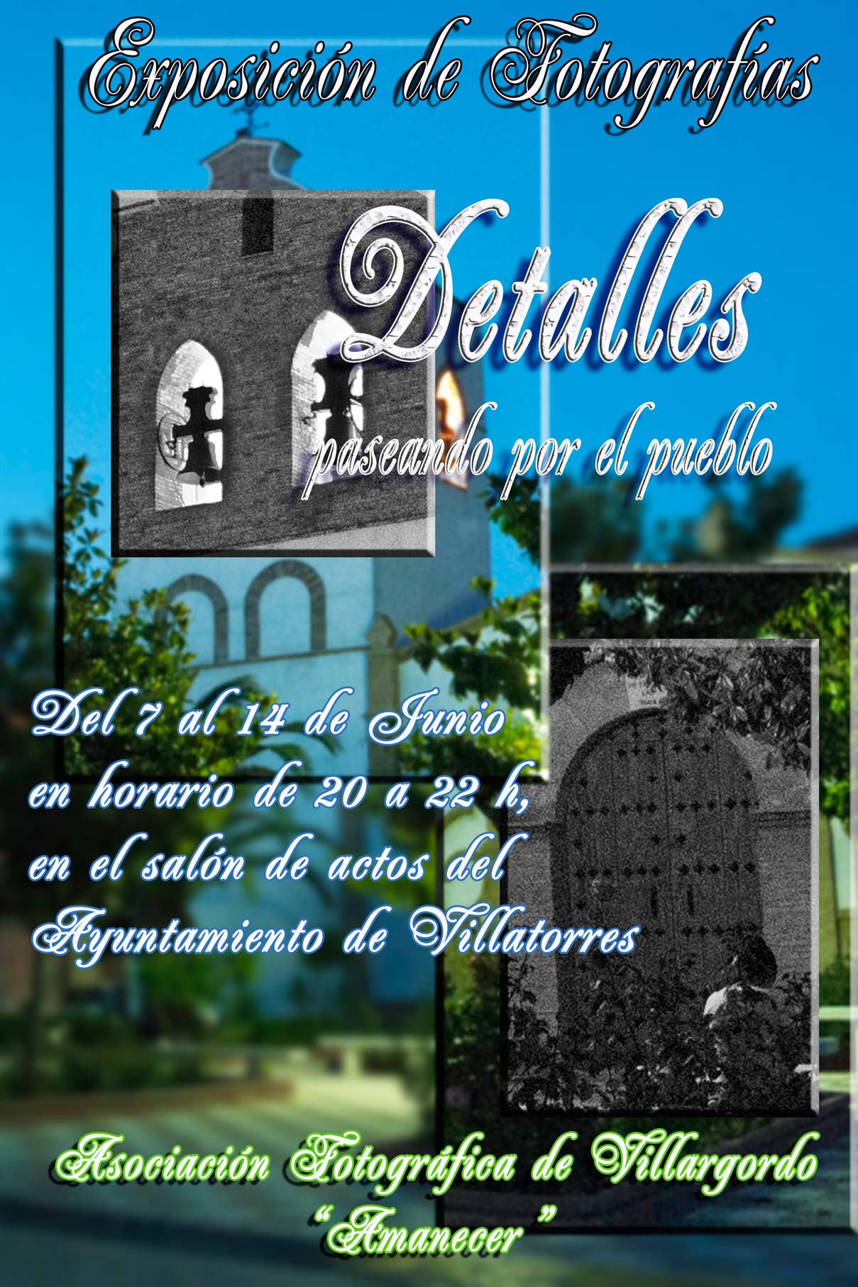 Del día 7 al 14 de Junio en horario de 20 a 22 h. tendrá lugar en el Salón de Actos del Ayuntamiento una Exposición de Fotografía bajo el título de "Detalles paseando por el pueblo" a cargo de la Asociación Fotográfica "Amanecer". Aquí tenéis el cartel en el que se anuncia.